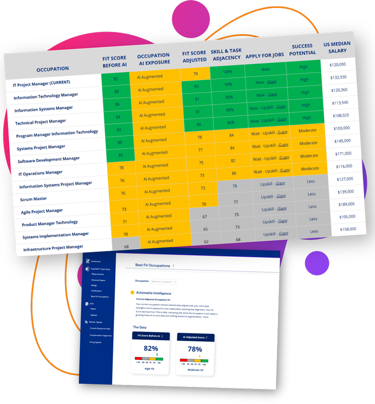 - Shows AI-adjusted occupation fit strength using our proprietary AI Work Exposure Index™ to determine how AI is changing tasks inside each occupation.